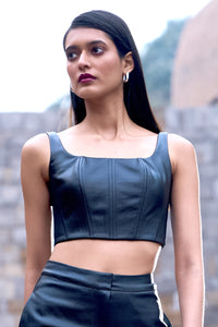 This waxed black denim corset top features structured boning and jeanswear-inspired stitch lines for a bold, fashion-forward look. Removable pad pockets add versatility, while a zip closure at the back ensures a sleek fit. Fully lined for comfort, this top combines edginess with refined details for a standout piece.