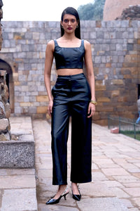 This waxed black denim corset top features structured boning, jeanswear-inspired stitch lines, and removable pad pockets for added versatility. A zip closure at the back ensures a sleek fit, while the top is fully lined for comfort. Paired with matching straight pants, the set offers a hook/eye and zip closure at the waist, along with side pockets, combining edgy style with everyday practicality.