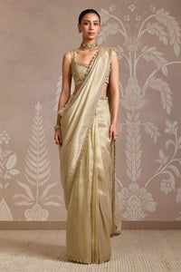 Featuring Weave Aurora Gold Sari Set by Ridhi Mehra's In the Folds Summer Collection '25. This stunning set includes a placement embroidered striped tissue sleeveless blouse paired with an embroidered flat-stitched saree. The saree gown and belt are crafted from luxurious tissue fabric in a radiant light gold hue.