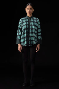 The Wheel Green Shirt is a sophisticated and stylish garment crafted from a luxurious blend of silk and cotton fabric. This combination brings together the softness and breathability of cotton with the smooth, lustrous sheen of silk, creating a comfortable yet elegant feel. The rich green color adds a vibrant touch, making the shirt perfect for both casual and semi-formal occasions.
