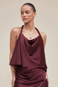 A halter cowl neck top with knot details along the neckline. Extended satin drape on both sides. Asymmetric hem.