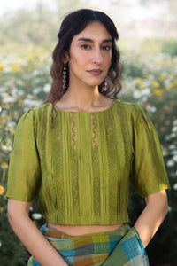Handwoven organza mulberry silk sets the canvas for embroidery and stitching detail that mimics lace, dancing over both front and back. A fitted handwoven mulberry silk slip lines the blouse, while a side zip allows for ease and structure in one seamless gesture.