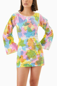 This cotton dress effortlessly blends style with versatility. Featuring a light-reactive print, it adds a playful twist as the colors shift with varying light conditions. The dress is designed with a flattering round neckline and showcases a unique cutout waist that adds an element of sophistication. Long, flared sleeves enhance the dress's graceful silhouette, while the adjustable elastic waistband at the back ensures a customizable fit that accentuates your shape. Ideal for both casual outings and special occasions, this dress combines comfort with eye-catching details for a standout look.