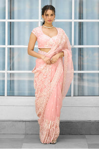 A dreamy pink creation in luxurious silk organza, delicately adorned with hand embellishments. Effortlessly elegant, this sari captures timeless grace and modern charm, perfect for celebrations that call for a touch of romance and sophistication.