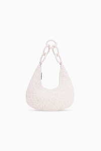 Featuring the White Abraxas Handbag by 5 Elements by Radhika Gupta. Elevate your style with sophistication and glamour. Adorned with intricate stone sequence embroidery, this chic accessory makes a bold statement. Impeccably crafted with leatherette and a detachable crossbody chain, it's a perfect blend of timeless elegance and contemporary fashion.