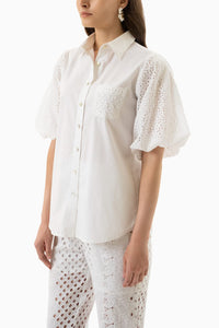 Featuring a chic white shirt in cotton satin fabric with flouncy sleeves and a pocket patch.