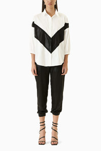White cotton satin shirt with metallic crepe fabric detailing and matching jumper pants.