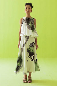 A breezy sleeveless layered top and flowy A-line skirt feature abstract green and black botanical prints on white. Clean and contemporary, it’s perfect for effortless day-to-night style.