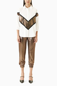 White cotton satin shirt with metallic crepe fabric detailing and matching jumper pants.
