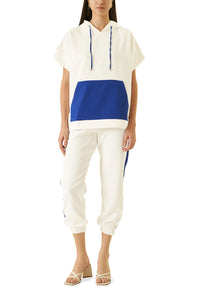 Off white luxury crepe track set with royal blue detailing.