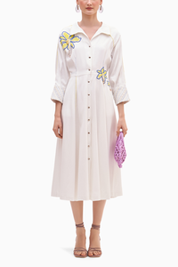 Introducing the Banana Floral White Cotton Embroidered Dress, a charming midi that combines elegance with playful details. This fully lined button-down dress features hand-embroidered flowers on the raglan and pockets, enhancing its whimsical appeal. Snap buttons, lace accents, and pintuck cuff details add a touch of sophistication, while the 3/4 sleeves with an elasticated back ensure a comfortable fit. With its flattering fit-and-flare silhouette and convenient side pockets, this dress is perfect for any occasion!
