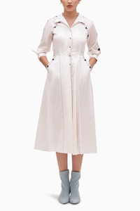Introducing the Beloved White Cotton Applique Button-Down Dress, a delightful calf-length midi that exudes charm. Featuring 3/4 sleeves and a fully lined design with an elasticated back, this snap button dress is adorned with heart appliqués on the sleeves, raglan, and pockets. The statement cuff details with stitch lines and piping add a stylish touch. With its flattering fit-and-flare silhouette, this dress is perfect for any occasion!