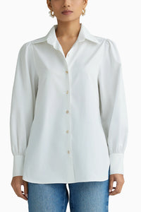 The Egyptian cotton bishop-sleeved shirt in white is crafted from 100% Egyptian Giza Cotton with a luxurious 120/2 thread count, featuring elegant mother-of-pearl buttons and soft gathers at the shoulder and cuff for a refined, timeless finish.
