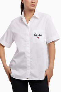Effortlessly charming, this relaxed-fit shirt features a classic collar and half sleeves.A delicately embellished pocket with bead and thread heart embroidery that adds a playful, romantic touch.