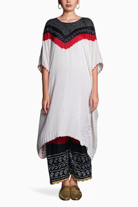 Featuring White Black Kaftan top with bandhani pants.