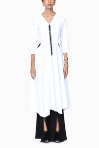Featuring White & Black Pina Set by 431-88 Shweta Kapur from The Popsicle Collection. Elevate your style in this mid length V-neck dress in jersey with boot cut trousers, with a hanging embroidered detail from the neckline. Dress it up with a pair of heels and some jewellery.