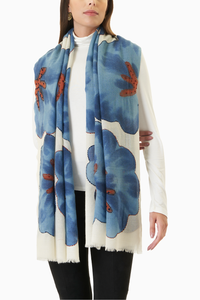 Our collection of Shawls in 100% Merino Wool for modern and resourceful women. The entirely hand-painted floral scarf with a textured weave is characterized by a size of 80 x 180 cm and katha style embroidery details making the stole truely one of a kind. Perfect to be wrapped around the neck and wear it in a casual and contemporary way.