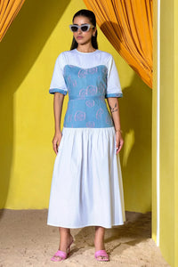 Featuring The Marrakech Dress by Bohochic's Palmera Collection. This exquisite silhouette showcases a chic denim bodice adorned with all-over appliqué roses, making it the perfect choice for a summer lunch or a stylish sundowner.