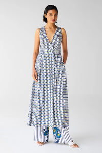 Featuring White Blue Overlap Dress and Trouser Set by Cotton and Clay, a stylish two-piece ensemble in soft cotton satin twill. The block-printed sleeveless overlap dress pairs effortlessly with matching trousers in white and navy blue, creating a modern, elegant look with timeless appeal.