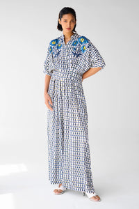 Featuring White Blue Printed Jumpsuit by Cotton and Clay, a contemporary one-piece crafted from luxurious cotton satin twill. The block-printed design with front pleats in elegant white and navy blue tones offers a perfect blend of comfort, sophistication, and modern style.