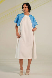 Featuring an A-line silhouette in a soft, structured drape, this dress showcases hand-embroidered sleeve panels with looped PVC cord in cool blue. Designed to fall below the knee, it is finished with a round neckline and a discreet back zip fastening for a clean, modern look.
