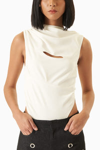 Featuring the White Bodysuit Harley by deWAR. Crafted from woven crepe, this bodysuit is designed to make you feel strong, confident, and free. Featuring dramatic cut-outs and shoulder pleats, it offers a bold and stylish look.