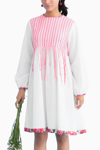 Featuring White Candy Stripes Pintuck Shift Dress by Nikasha from Matchbox Series. Accentuated with vintage rose print details at the bottom and thread tassels details in 100% cotton poplin.