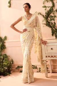 Featuring White Chiffon Saree and Blouse by Rose Room from it's Hue De Paradise Collection. It's a white lace detailing saree with blouse would be a stunning combination for a traditional yet contemporary look. The chiffon fabric would give the saree a light and flowing drape, while the white lace detailing adds a touch of sophistication and elegance. The yellow and white blouse could complement the saree beautifully, perhaps with the yellow echoing the saree's color and the white providing a crisp contrast.