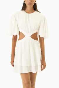 Featuring White crushed crepe cutout at waist dress. It has a cutout at waist with gathers blouson sleeves of elbow length. A round neck sun burst neckline with 2 layer frills in the bottom skirt part. Closure at back bodice with open metal zipper and elasticated waist band for comfort.