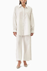 This all-white ensemble exudes modern elegance with a bold edge. The white cotton balloon sleeve shirt features voluminous sleeves and striking stud embellishments along the arms, offering a sculptural and contemporary silhouette. Paired with matching white cotton pants detailed with a sleek line of studs, the look is cohesive, polished, and perfect for a statement-making, minimalist aesthetic.
