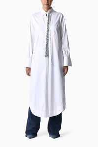 The Shirt Dress is going to be your summer day staple. It is cut in a lightweight cotton that is comfortable to wear. The tie like collar and a contrast printed facing are modern updates to an otherwise traditional silhouette. The dress is mid calf length with a curved hem, full sleeves with a wide cuff. Wear yours as a dress or with pants underneath.