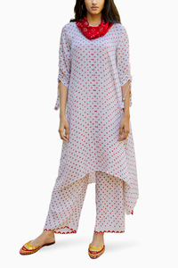 Elevate your style with our Asymmetrical Kurta featuring a striking Red Cowl and unique Concealed Pull-String Sleeves. Paired effortlessly with Straight Pants, this ensemble combines modern design and comfort, making it a versatile choice for any occasion.