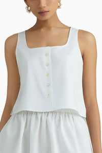 The sleeveless cropped cotton top in white is crafted from 100% Egyptian Giza Cotton with a 120/2 thread count, featuring mother-of-pearl buttons, a square-round neckline, and a subtle A-line shape with small side slits for an effortlessly elegant and refined look.