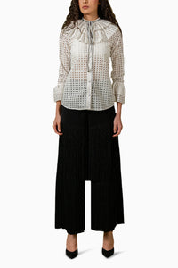 This White Cutwork Top in soft cotton features a band collar with delicate ruffled layers along the neck and sleeves, enhanced by elegant cape-style detailing and a tie-up bow trim. Sophisticated yet feminine, it’s perfect for polished evening looks, official meetings, or refined desk-to-dinner styling.