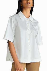 Featuring the White Egyptian Cotton Bowling Shirt by Refined Revolution. Crafted from 100% Egyptian Giza Cotton with a luxurious 120/2 thread count, adorned with mother of pearl buttons. Its A-line fit with back yoke gathers ensures a relaxed yet sophisticated look, true to size.