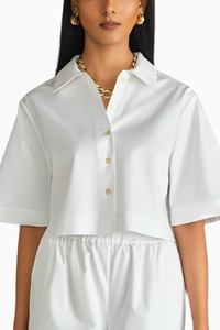Featuring the White Egyptian Cotton Cropped Bowling Shirt by Refined Revolution. Made from 100% Egyptian Giza Cotton with a luxurious 120/2 thread count, it has mother of pearl buttons and an A-line fit with back yoke gathers. Designed for a relaxed fit, true to size.
