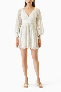 Featuring rose lace detailing with blouson sleeves, V- neckline and a flared skater skirt, this airy short dress makes for the perfect flirty wardrobe staple.