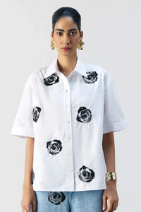 Delicate yet striking, this embroidered shirt features intricate rose embellishments, a classic button-down front, and a timeless silhouette.
