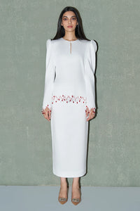 A white co-ord set featuring a structured long-sleeve top paired with a matching straight-fit skirt. The top is designed with defined shoulders and a minimal keyhole detail at the neckline. Hand-applied red bead embellishments accent the cuffs and hemline, adding a refined statement to the clean silhouette.
