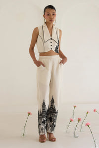 This white co-ord set features straight pants embroidered with intricate building structures. Paired with a swallow-tailed collar crop top detailed with contrast lace, side zip, and show buttons. Embroidery and piping on one side of the princess cut add a refined, architectural touch.