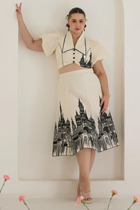 This white co-ord set features an A-line midi skirt embroidered with detailed building structures. Paired with a swallow-tailed collar crop top accented with contrast lace, side zip, and show buttons. Embroidery and piping on one side of the princess cut add a sophisticated architectural flair.