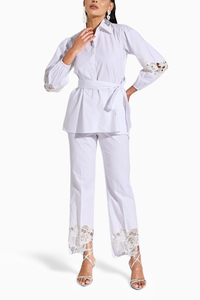 Featuring a cotton shirt with puff sleeves with flower detailings and tie-around belt, paired with high low flower highlighted pants.