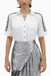 Look no further - the perfect essential white shirt is here. Oh, and it comes with a touch of glam with bejeweled details: Indulge in our timeless and minimal but the very chic white swarovski ribbon shirt that can be styled seamlessly with all the bottoms your wardrobe holds.