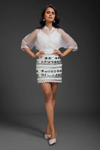 Featuring White Foil Metallic Skirt by Deepika Arora. A sleek skirt adorned with eye-catching neon metallic detailing, perfect for adding a bold, luminous touch to your outfit. Ideal for stylish, standout occasions and contemporary fashion moments.