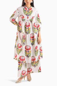 Brighten your day with this white kurta set adorned with bold, oversized floral prints that exude freshness and flair. The empire-line cut adds a soft, feminine shape, while the collared neckline and buttoned placket bring a touch of structure. Paired with breezy wide-leg pants, this pure cotton ensemble is made for comfort with a standout aesthetic.