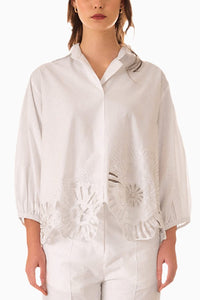 A graceful blend of sophistication and femininity. Crafted from premium fabric in pristine white, this blouse features delicate embroidered blooms and intricate cutwork detailing, adding a touch of whimsy and charm. The gathered design at the neckline creates a flattering silhouette. Perfect for both formal events and casual outings, this blouse is sure to elevate your ensemble with its timeless beauty and effortless grace.