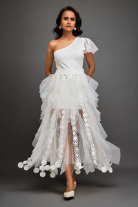 Featuring the White Geometry Tulle Skirt by Deepika Arora's Metallic collection, this layered tulle skirt is adorned with sharp geometric detailing, blending softness with structure. Made from Net and Vegan Leather, it offers a true-to-size fit and a distinctly modern silhouette.