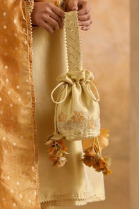 Complete your festive look with this elegant potli bag, designed to add a touch of sophistication. Made from Chevron Tissue Fabric, it features beautiful floral applique embroidery and intricate lace detailing to elevate your style. The fabric tassels bring an extra element of charm.