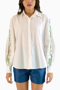 A dazzling blend of sophistication and glamour. Crafted from crisp white fabric, this shirt features intricate hand embroidery adorned with shimmering blue sequins, adding a touch of sparkle and vibrance. The upbeat design exudes energy and style, making it perfect for special occasions or adding a pop of excitement to your everyday ensemble. Pair it with trousers and shorts for a chic look or with denim for a more casual vibe.
