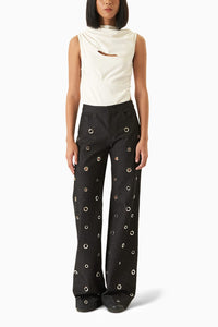 Featuring the White Bodysuit Harley with Silver Eyelet Pant by deWAR. The White Bodysuit Harley, crafted from woven crepe, exudes strength and confidence with dramatic cut-outs and shoulder pleats for a bold look. Paired with the Silver Eyelet Pant, adorned with scattered silver embellishments, it offers a modern blend of feminine and masculine styles, creating a versatile and stylish ensemble.